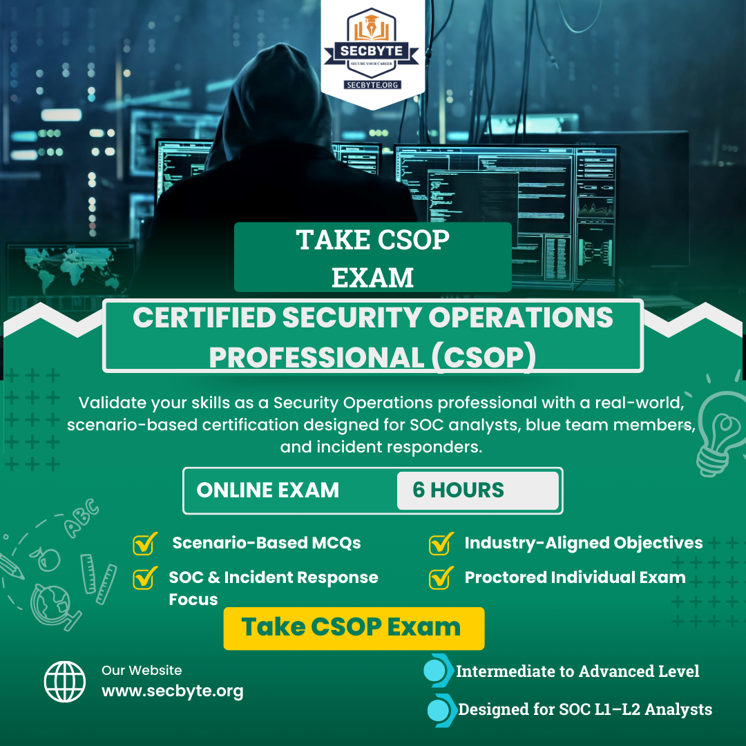 The Certified Security Operations Professional (CSOP) is an industry-aligned cybersecurity certification designed to validate real-world Security Operations Center (SOC) skills. Unlike theory-heavy exams, CSOP focuses on practical decision-making, incident analysis, and operational response expected from modern SOC analysts and blue team professionals.